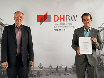 Für seine treu geleistete Arbeit überreichte Prof. Dr. Jörg Baumgart, Prorektor und Dekan der Fakultät Wirtschaft, Mitte September die Jubiläumsurkunde der Landesregierung an Prof. Dr. Harald Hartmann und verband damit auch seinen Dank und Anerkennung für die Verbundenheit Hartmanns zur DHBW Mannheim. Nach Studium und Promotion an der Universität Mannheim arbeitete Hartmann zunächst bei der Deutschen Verkehrs-Bank AG in Frankfurt und der Dachser GmbH & Co. KG in München bevor es ihn 2001 dann aber komplett in die Lehre an die damalige Berufsakademie zog. Kennengelernt hat er die Hochschule schon 1993, als er als nebenberuflicher Dozent Lehraufträge im Studiengang BWL-Industrie übernommen hatte. Heute nach über 20 Jahren in der Lehre ist er ein geschätzter Professor und erfahrener Kollege, der seit 2018 auch die Aufgabe des Studiendekans im Studiendekanat Internationales Management und Logistik an der DHBW Mannheim übernommen hat.