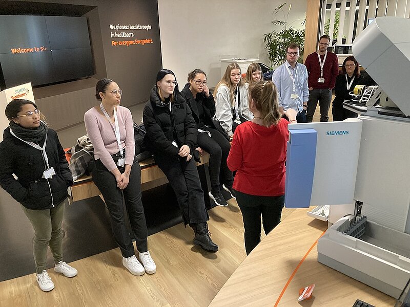Labordiagnostik ist ein wesentlicher Aspekt der Vorlesung "Krankheitslehre und Krankheitsprävention" von Herrn Dr. Martin Bäßler. Die Kursteilnehmer*innen TMED22 konnten sich am 7.2.2023 bei einer Exkursion einen Einblick in die Welt der Laborinstrumente bei Siemens Healthineers in Eschborn verschaffen. In Kleingruppen aufgeteilt, stellten Trainer*innen des dortigen europäischen Trainingszentrums und lokale Serviceleiter*innen den Erstsemesterstudierenden technische Verfahren und deren instrumentelle Realisierung für z. B. Blutbildanalytik, Blutgasbestimmung oder Infektionsdiagnostik vor. Auch Arbeitsprozesse des Laborbetriebs wurden angesprochen. Dafür stand eine große Automationsanlage für den Probentransport im Mittelpunkt der Betrachtungen.