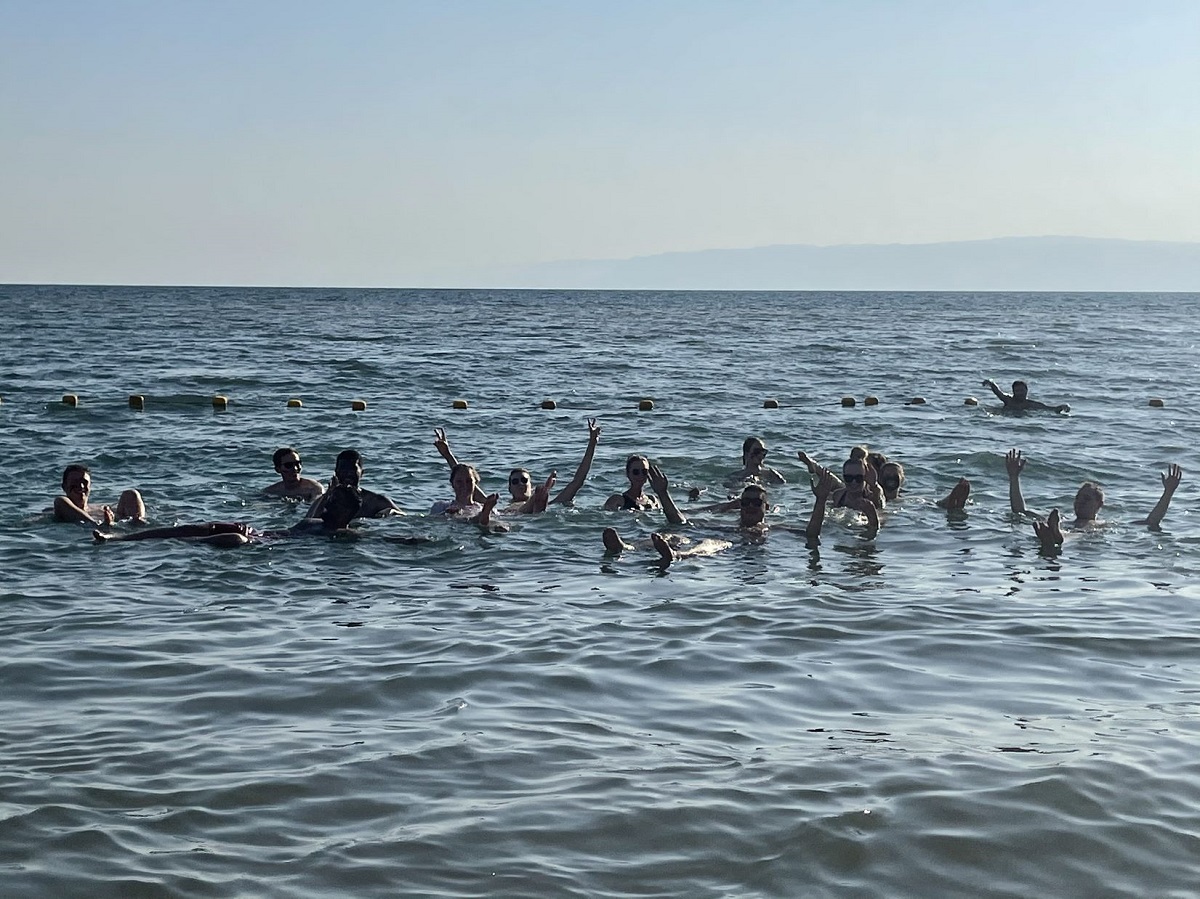 Wir besuchten am Dienstag zudem das Tote Meer, einer der faszinierendsten Orte Jordaniens. Von der Küste dieses Binnenmeers konnten wir Israel erkennen und erleben, wie sich der enorm hohe Salzgehalt von ca. 30% auf das Schwimmen auswirkt. Kurz gesagt: Alles, was man übers Schwimmen gelernt hat, funktioniert nicht! Man schwebt von alleine, treibt dahin, ohne unterzugehen, und kann so sogar entspannt lesen, während das Salz im Wasser die Haut um 10 Jahre jünger macht. Sich mit Schlamm des Toten Meers einzureiben hat übrigens denselben Effekt und wir konnten auch das live erleben, ohne den Schlamm, der in die ganze Welt verkauft wird, teuer bezahlen zu müssen.