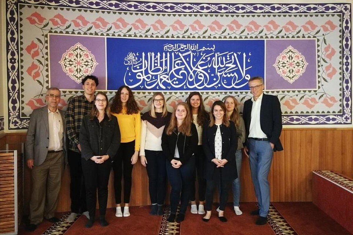 Dem Engagement von Dr. Hourani war auch ein Besuch in der größten Moschee in Deutschland zu verdanken. Seine Erläuterungen im traditionellen Waschraum sowie im beeindruckenden Gebetssaal der Yavuz-Sultan-Selim-Moschee in Mannheim brachten den Studierenden den Islam näher, dessen Bilderverbot insbesondere vielseitige Kalligrafien hervorgebracht hat.