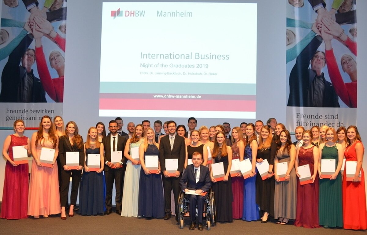 Geschafft: Bei der "Night of the Graduates" der DHBW Mannheim nahmen die Absolvent*innen unserer Studienrichtung Ende November in einem feierlichen Rahmen ihre Bachelor-Urkunden entgegen. Sie und die Studienrichtung blickten – im Kreise von über 200 Verwandten und Freund*innen – auf die Highlights und Herausforderungen der letzten 3 Jahre zurück. Dabei wurden auch so manche Freundschaften geschlossen, die weit über die gemeinsame Zeit an der DHBW hinaus Bestand haben werden.